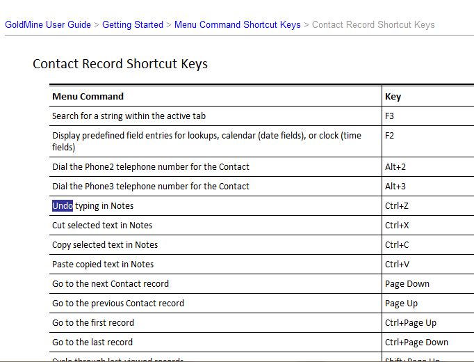 Even with the new GoldMine Premium interface you still have many “Shortcut Keys” available. For a complete listing you can refer to “HELP” under Getting Started > Menu Command Shortcut Keys.