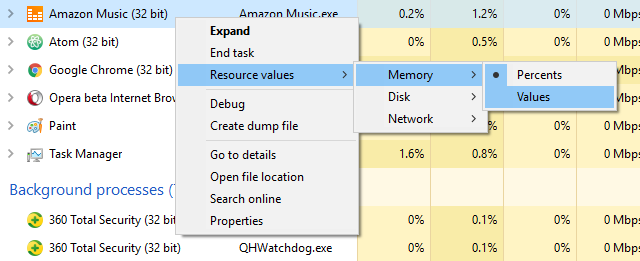 To toggle these, just right-click on any process, navigate to the Resource Values submenu, pick the resource type you want to change, and select either Values or Percents.