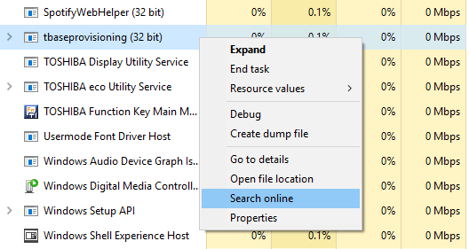 Windows can help. Just right-click on any process and select the Search Online action. This will launch a search in your browser with the application name and the process name, which will help you to determine whether or not it’s safe or malicious.
