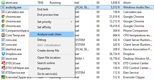 That’s when the Analyze Wait Chain feature in the Task Manager comes in handy. It can tell you when a process is stuck waiting on another process, which can help you identify why an application isn’t responding (i.e. which process is the real culprit). Only available under the Details tab.