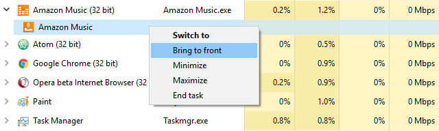 - Bring to Front: Brings focus to the application, but doesn’t minimize Task Manager. Doesn’t work if there’s another application that’s “Always on Top”.