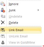 First, the GoldMine window pane has been removed. Users can access all Outlook Link functions via the GoldMine ribbon menu. And now many of those functions are also accessible via a right-click on an email in your inbox/sent items view. See image