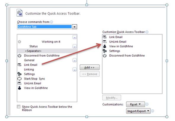 For even easier access to functions, users can add the Outlook Link buttons to Outlook’s Quick Access Toolbar (shown at the top-left corner of the Outlook window). And now the GoldMine 2017 installer will automatically add the “GM” and “GM Company” columns to users’ inbox and sent items folders. Previously, this had to be done manually