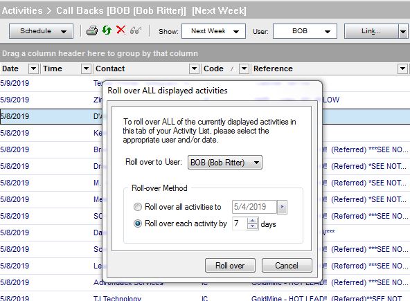 Now I was ready to use GoldMine’s “roll over” feature, located on the local menu inside the GoldMine Activity list, to “roll over” (push off) a filtered set of activities. The roll over tool let me chose to reschedule the list by either a number of days or all of them to a specific date when when I will have the time to handle them.