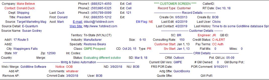 One of the most important screens in your GoldMine CRM system is the Primary View of a Contact Record. The Primary View is the top-half of the screen when you’re looking at a Contact Record in your GoldMine database.