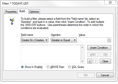 Filters are constructed using an expression builder in GoldMine. Once you start a new filter the builder will pop open to allow you to select the fields you want to pick from and the values you’re looking for a record to contain. GoldMine’s filters can only search the primary (contact1) and custom (contact2) fields tables. The basic concept of a filter is that it identifies records in your CRM database which certain values in specific fields.