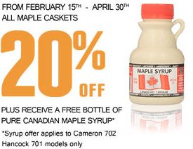 Let’s just start with the concept of giving away a “Free bottle of Maple Syrup with the purchase of a maple casket.” Really?! How could a bottle of maple syrup possibly be an effective incentive to choose one casket over another? That doesn’t make sense on multiple levels! LOL.